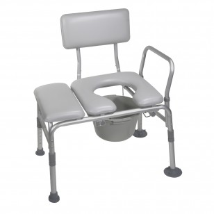 This versatile product from Drive Medical combines a transfer bench and a commode into one. Its comfortable cushioned seat and backrest and 1" aluminum-frame construction provide comfort and stability. The seat's back adjusts tool-free for your convenience, while extra large suction cups provide added safety. The product comes with a 7.5 quart commode bucket.