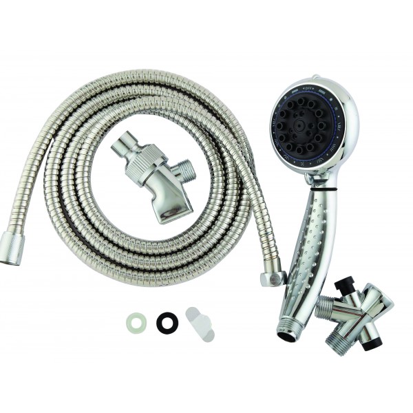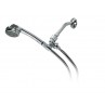 - Chrome shower-arm mount and extra-long 84" chrome/mylar reinforced tangle-free hose